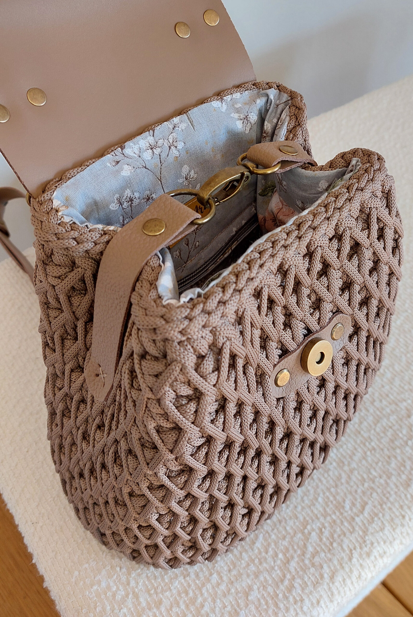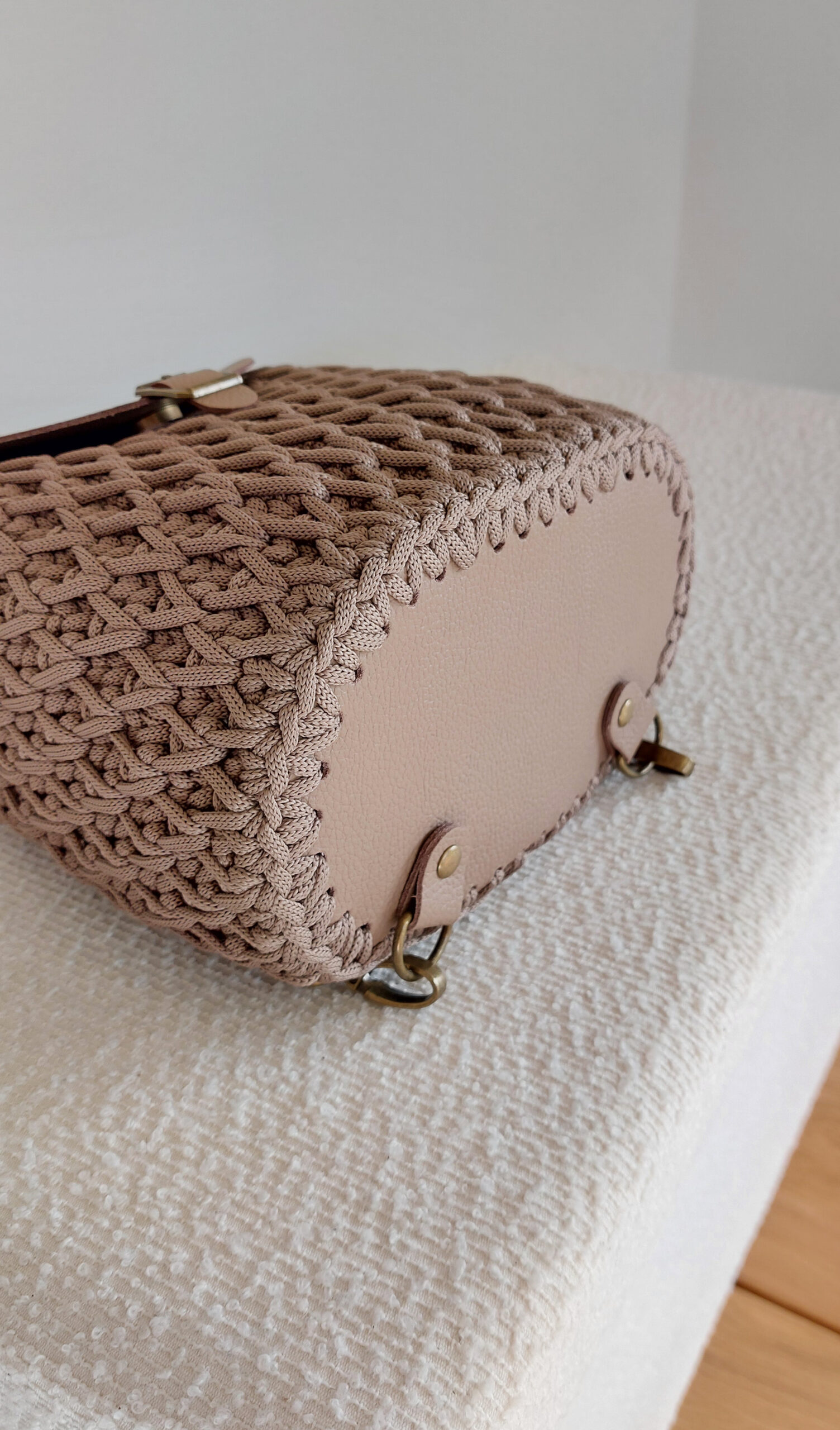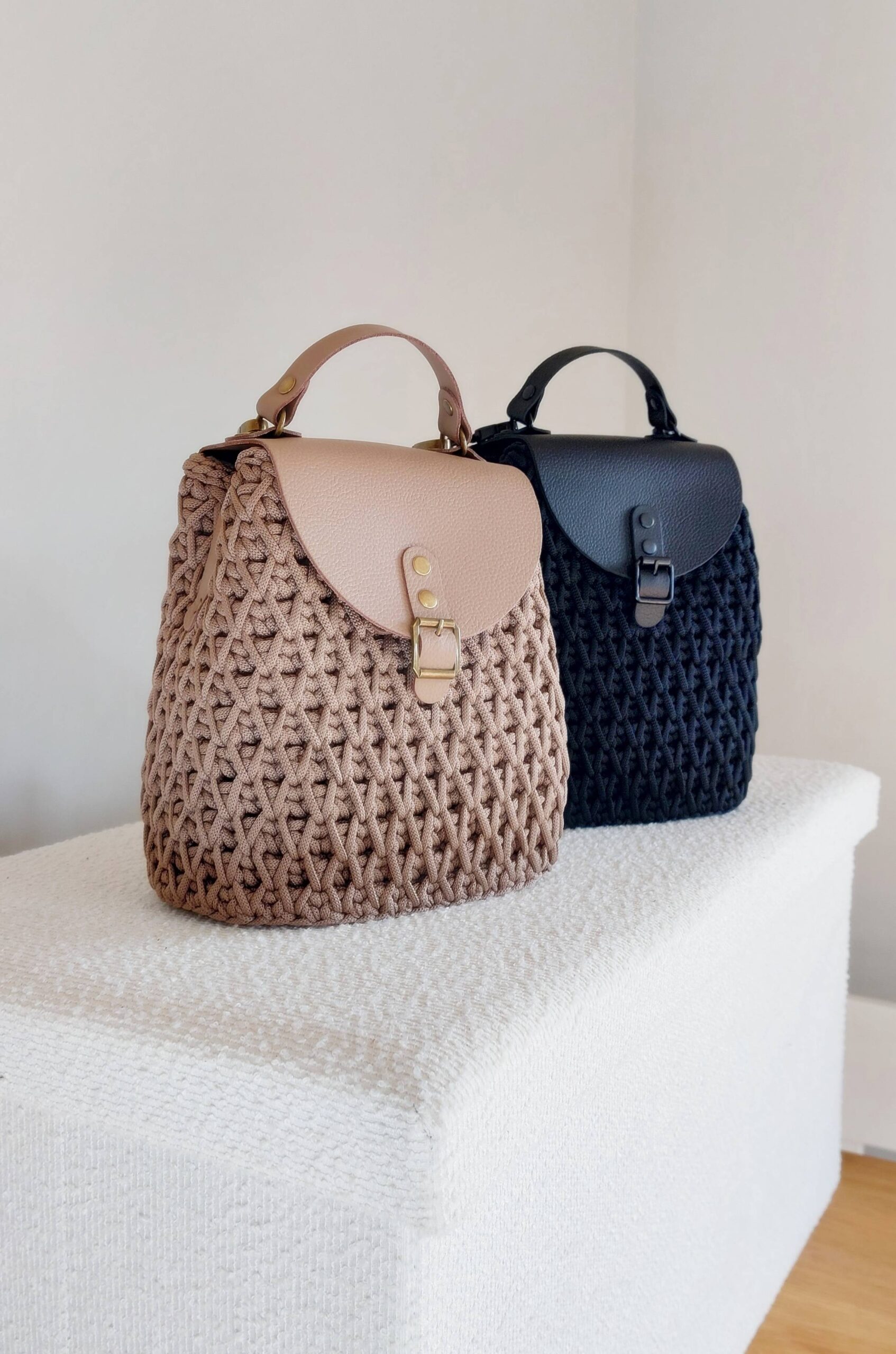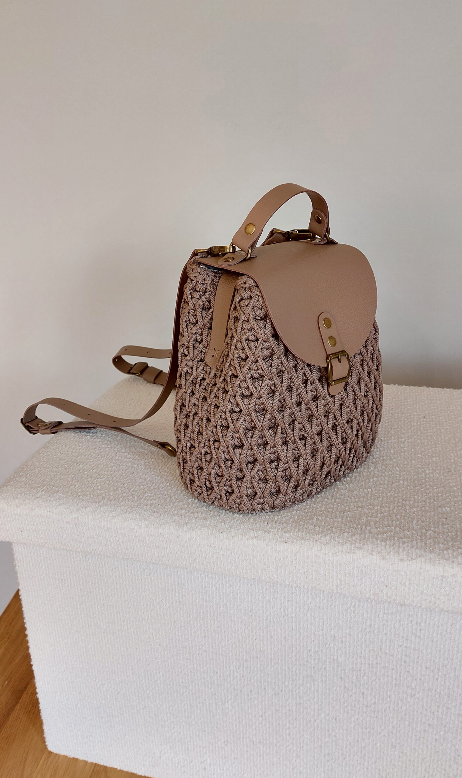 Elegancki plecak wykonany ręcznie na szydełku z wysokiej jakości sznurka jedwabnego poliestrowego w kolorze czarnym, w połączeniu z elementami ze skóry naturalnej. Każdy egzemplarz jest unikatowy – staranne rzemieślnicze wykonanie gwarantuje trwałość, solidność i wyjątkowy charakter.