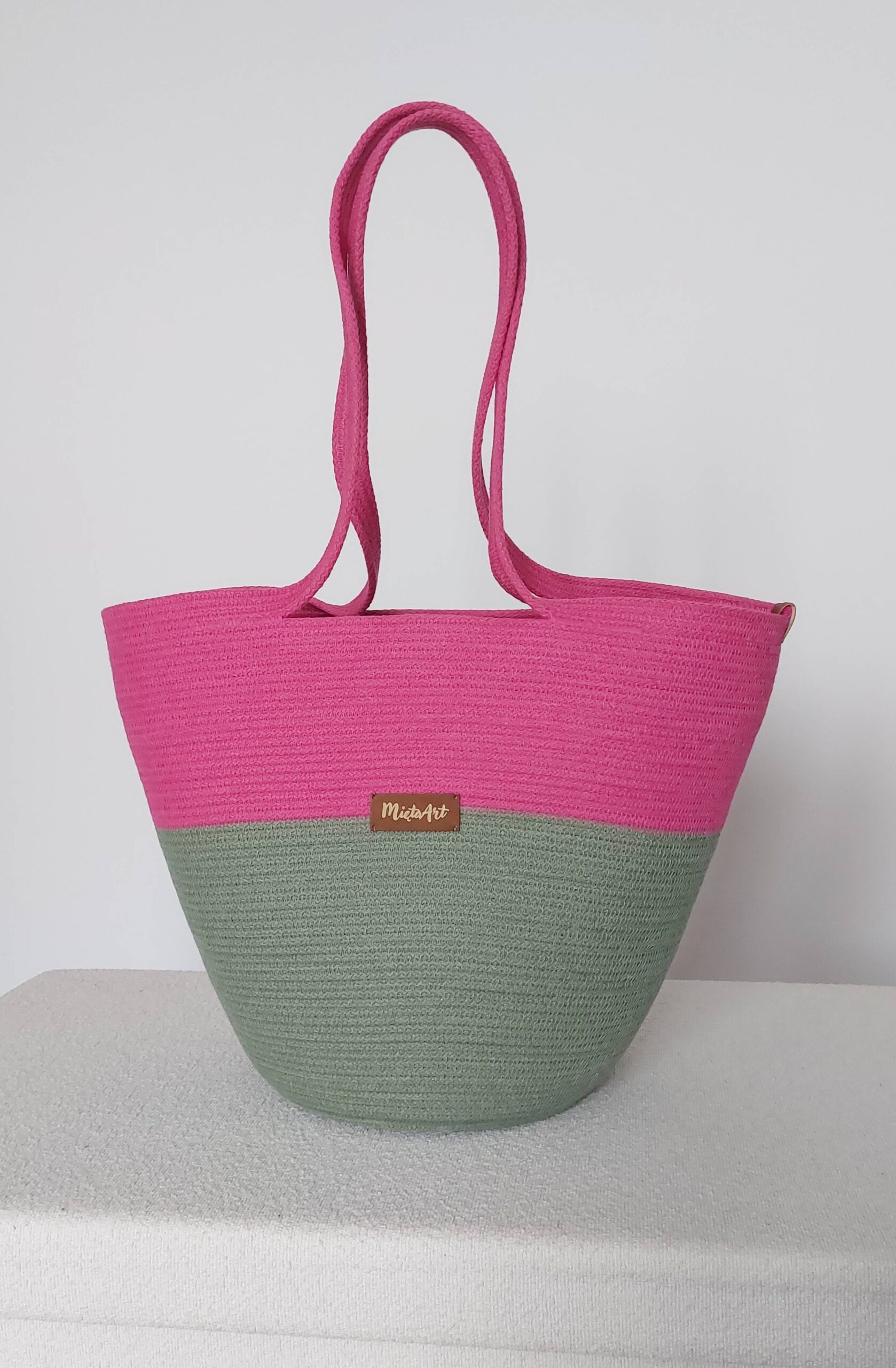 Poznaj ręcznie wykonaną torebkę typu kosz, stworzoną ze sznurka z recyklingowanej bawełny certyfikowanej OEKO-TEX®, wzmocnionego poliestrowym rdzeniem, który zapewnia trwałość i stabilność.
