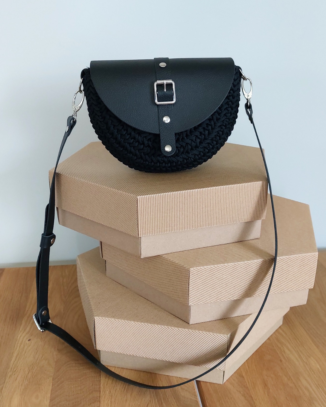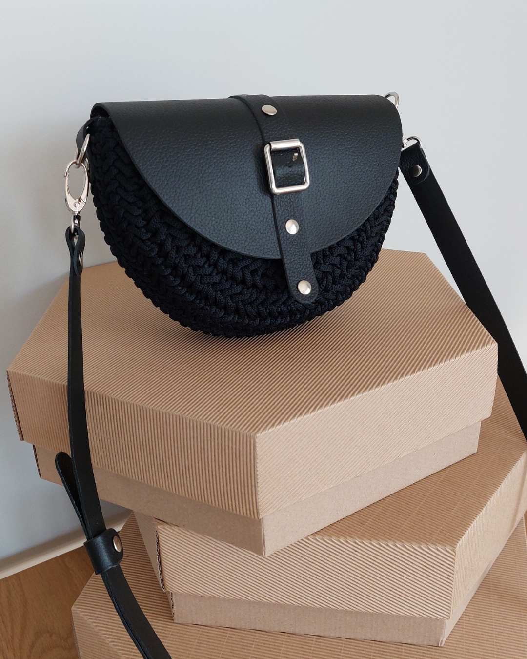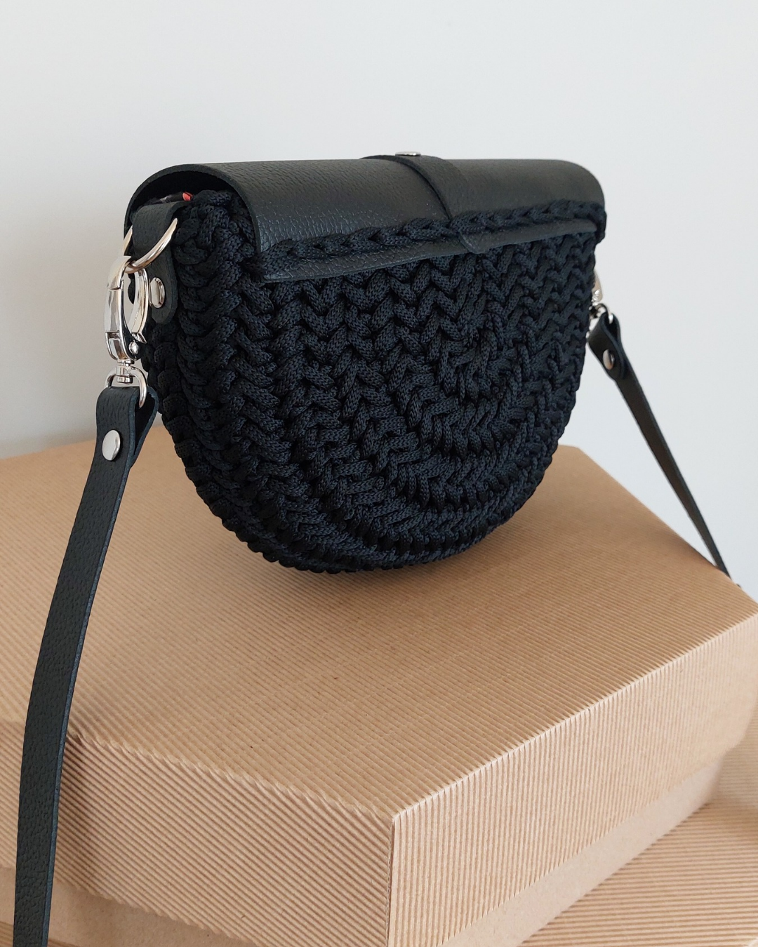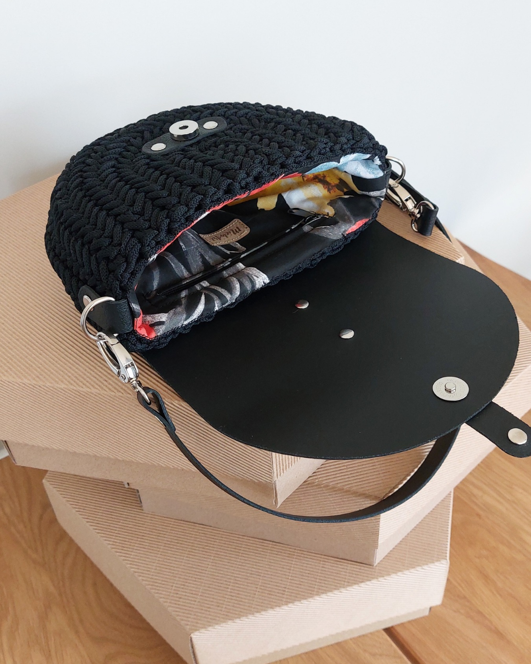 Ręcznie wykonana torebka średniej wielkości, zrobiona z wysokiej jakości sznurka (100% jedwab poliestrowy) oraz elementów ze skóry naturalnej. Zapinana na magnes, z bawełnianą podszewką i praktyczną kieszonką na zamek.