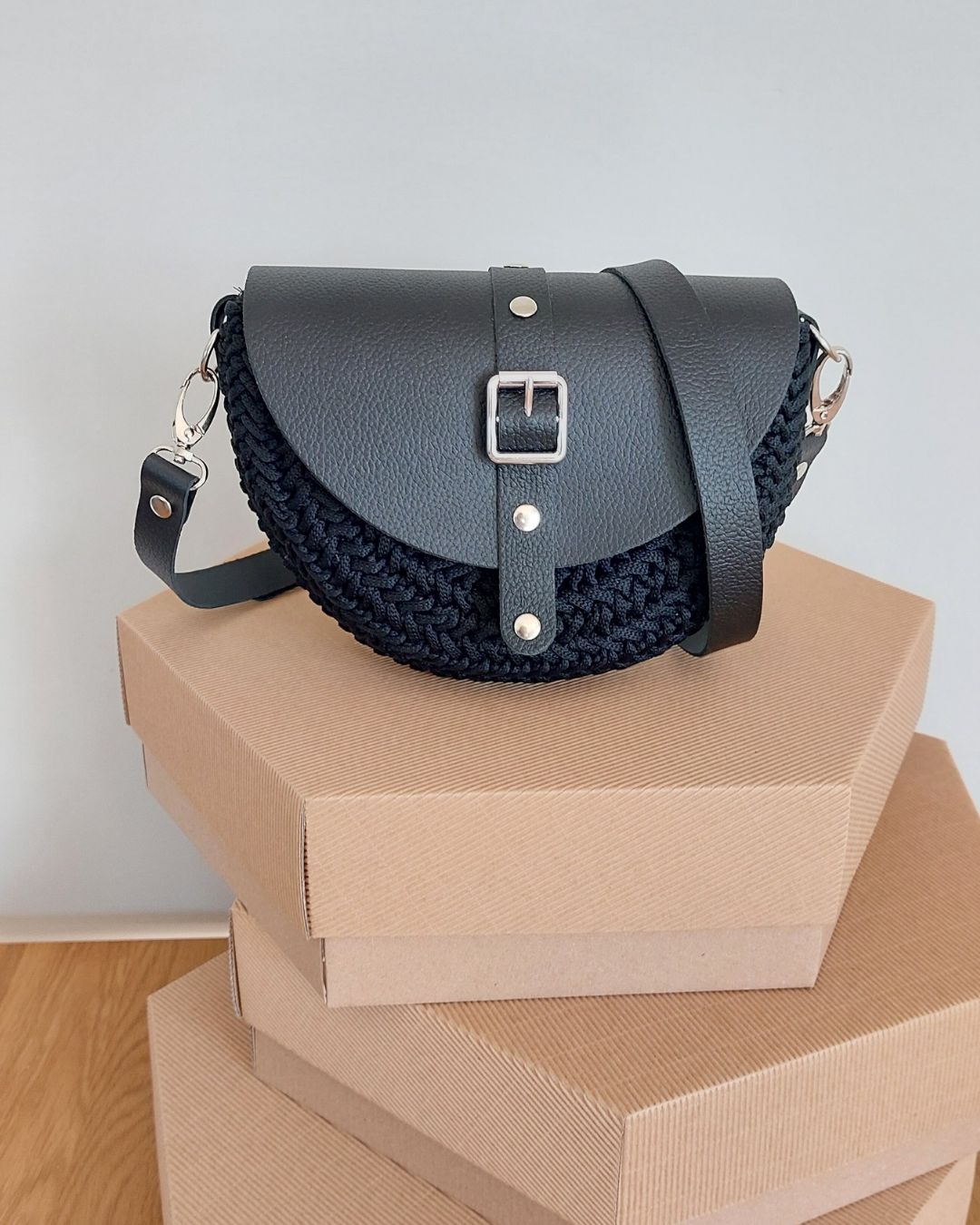 Ta wyjątkowa torebka powstaje z wysokiej jakości sznurka premium (100% jedwab poliestrowy), który nadaje jej subtelną strukturę i elegancki wygląd. Całość uzupełniają elementy ze skóry naturalnej – klapa, pasek oraz detale – tworząc harmonijną i ponadczasową kompozycję.