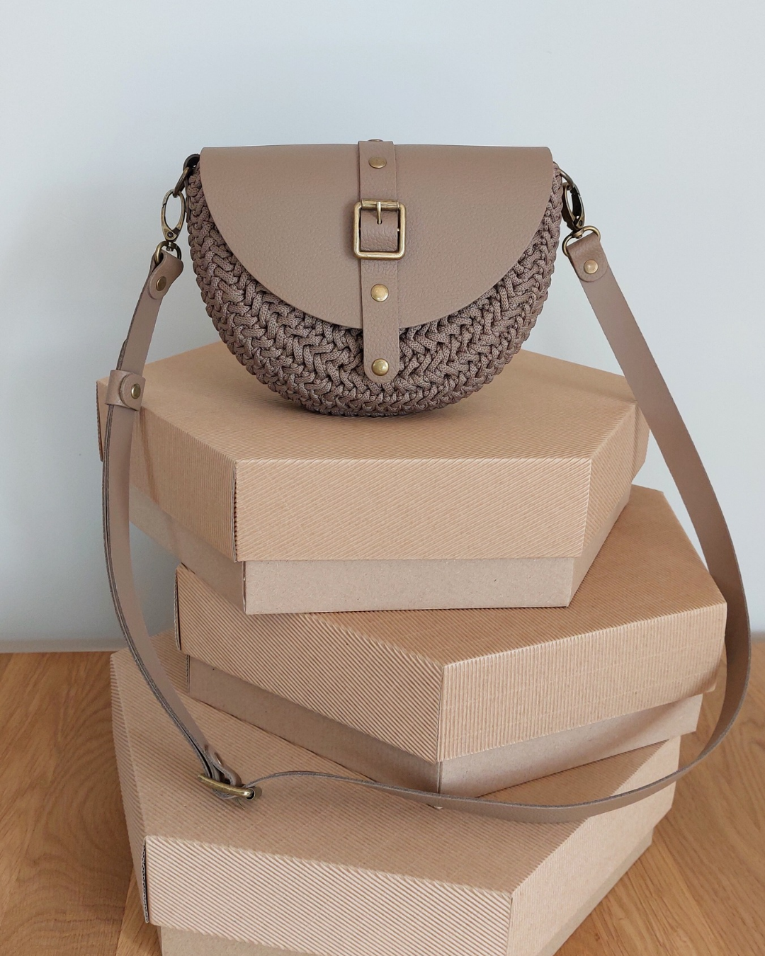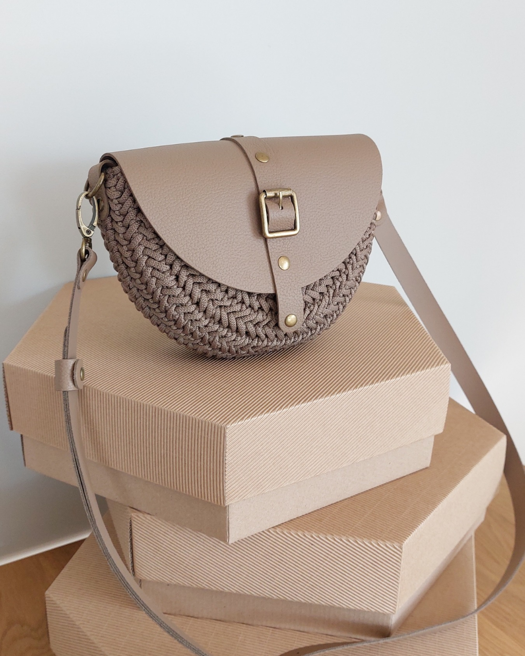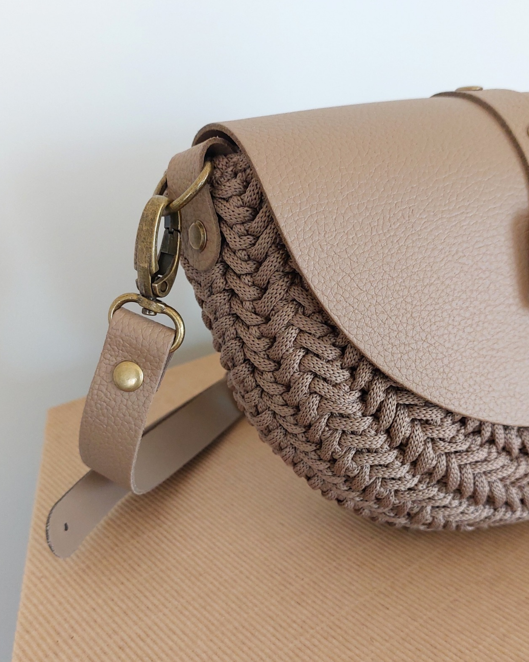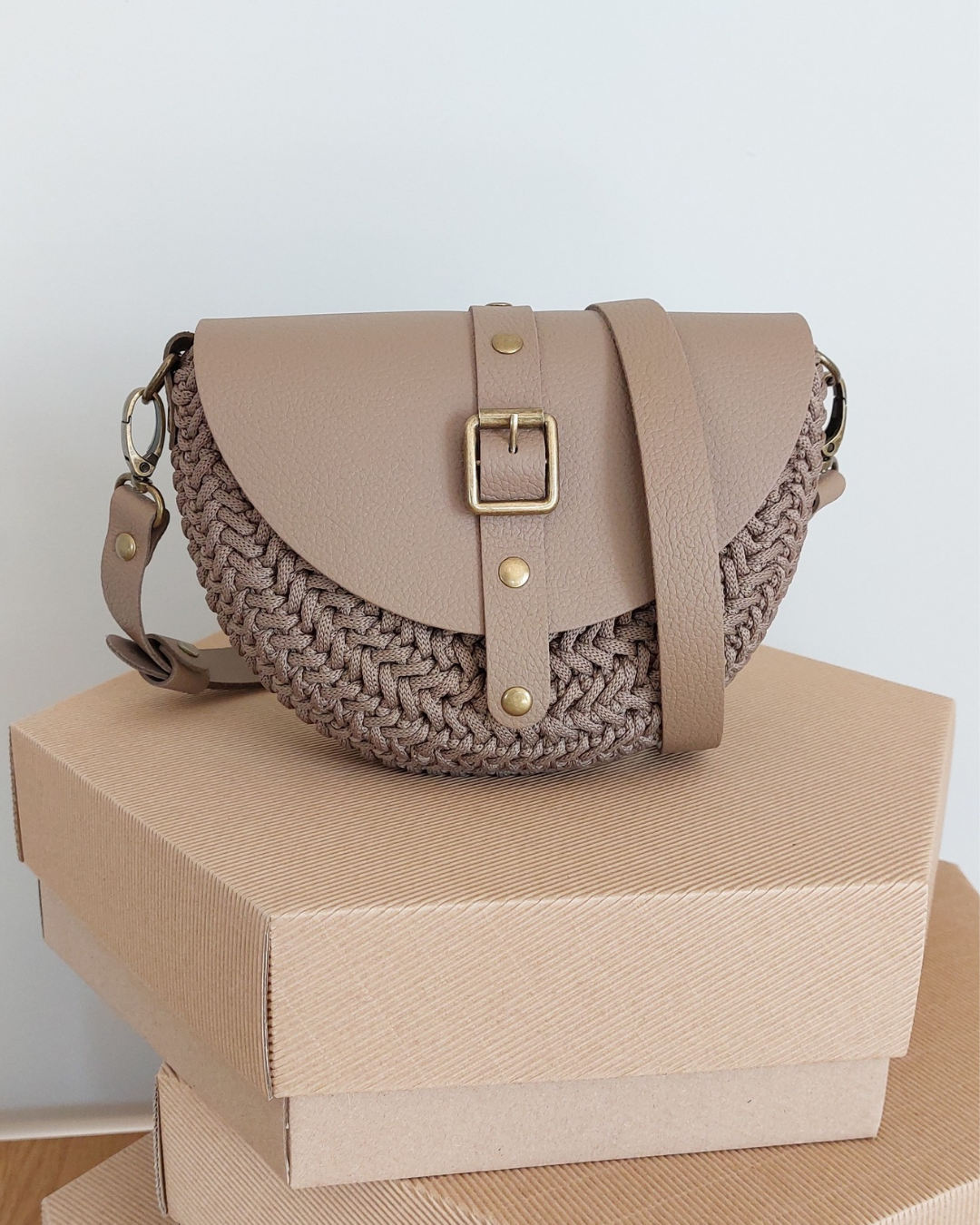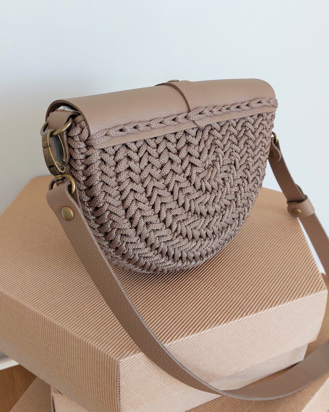 Ta wyjątkowa torebka powstaje z wysokiej jakości sznurka premium (100% jedwab poliestrowy), który nadaje jej subtelną strukturę i elegancki wygląd. Całość uzupełniają elementy ze skóry naturalnej – klapa, pasek oraz detale – tworząc harmonijną i ponadczasową kompozycję.