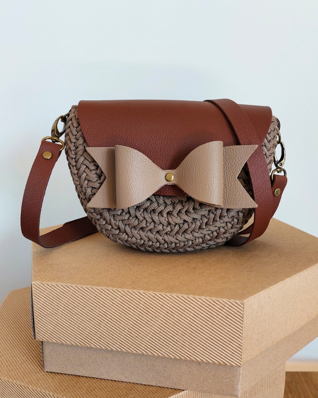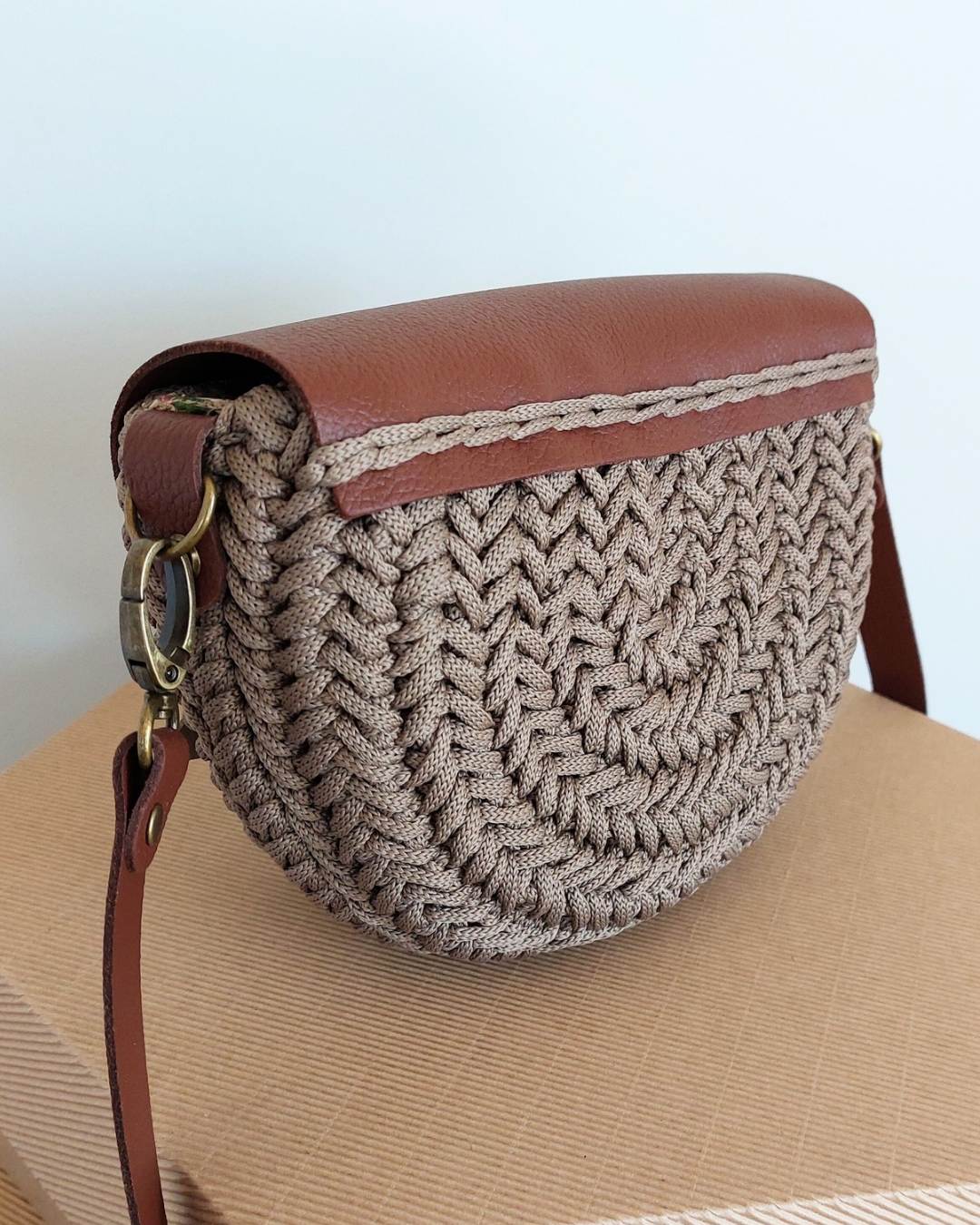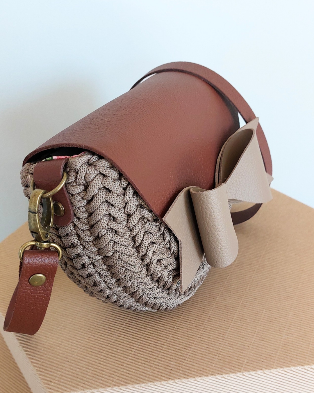 Ta wyjątkowa torebka powstaje z wysokiej jakości sznurka premium (100% jedwab poliestrowy), który nadaje jej subtelną strukturę i elegancki wygląd. Całość uzupełniają elementy ze skóry naturalnej – klapa, pasek oraz detale – tworząc harmonijną i ponadczasową kompozycję.