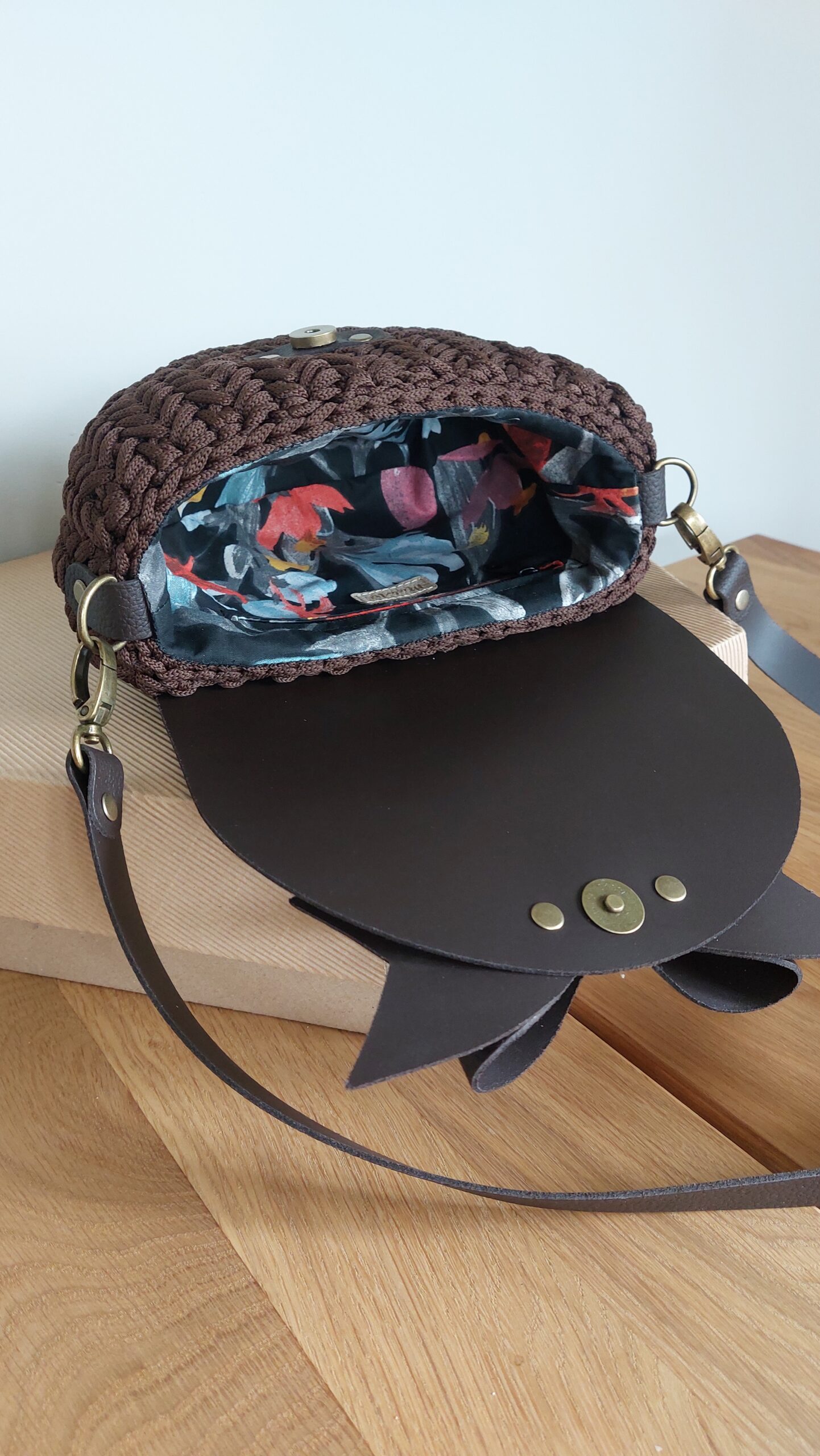 Ręcznie wykonana torebka średniej wielkości, zrobiona z wysokiej jakości sznurka (100% jedwab poliestrowy) oraz elementów ze skóry naturalnej. Zapinana na magnes, z bawełnianą podszewką i praktyczną kieszonką na zamek. Klapa ozdobiona kokardą.