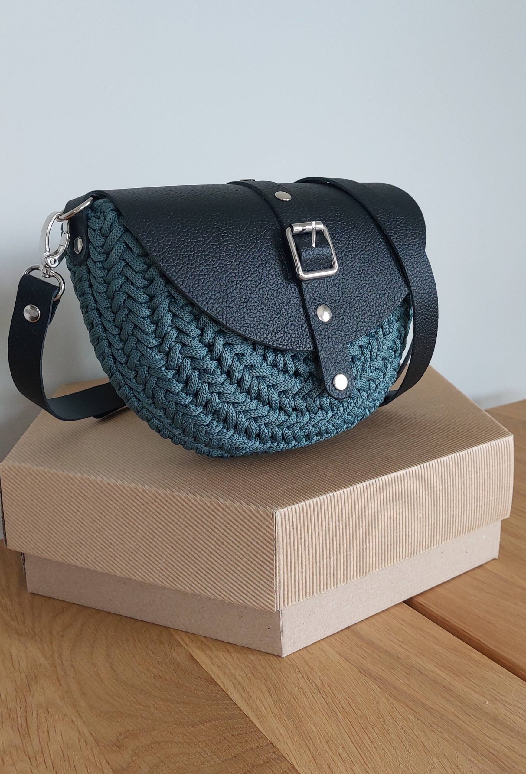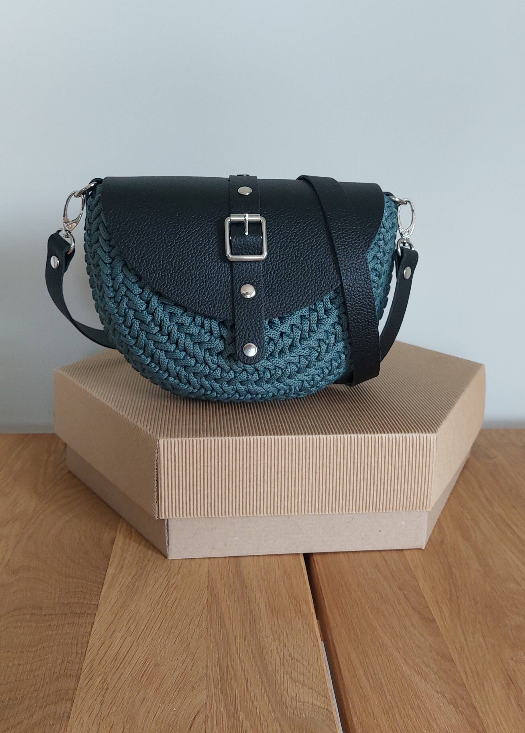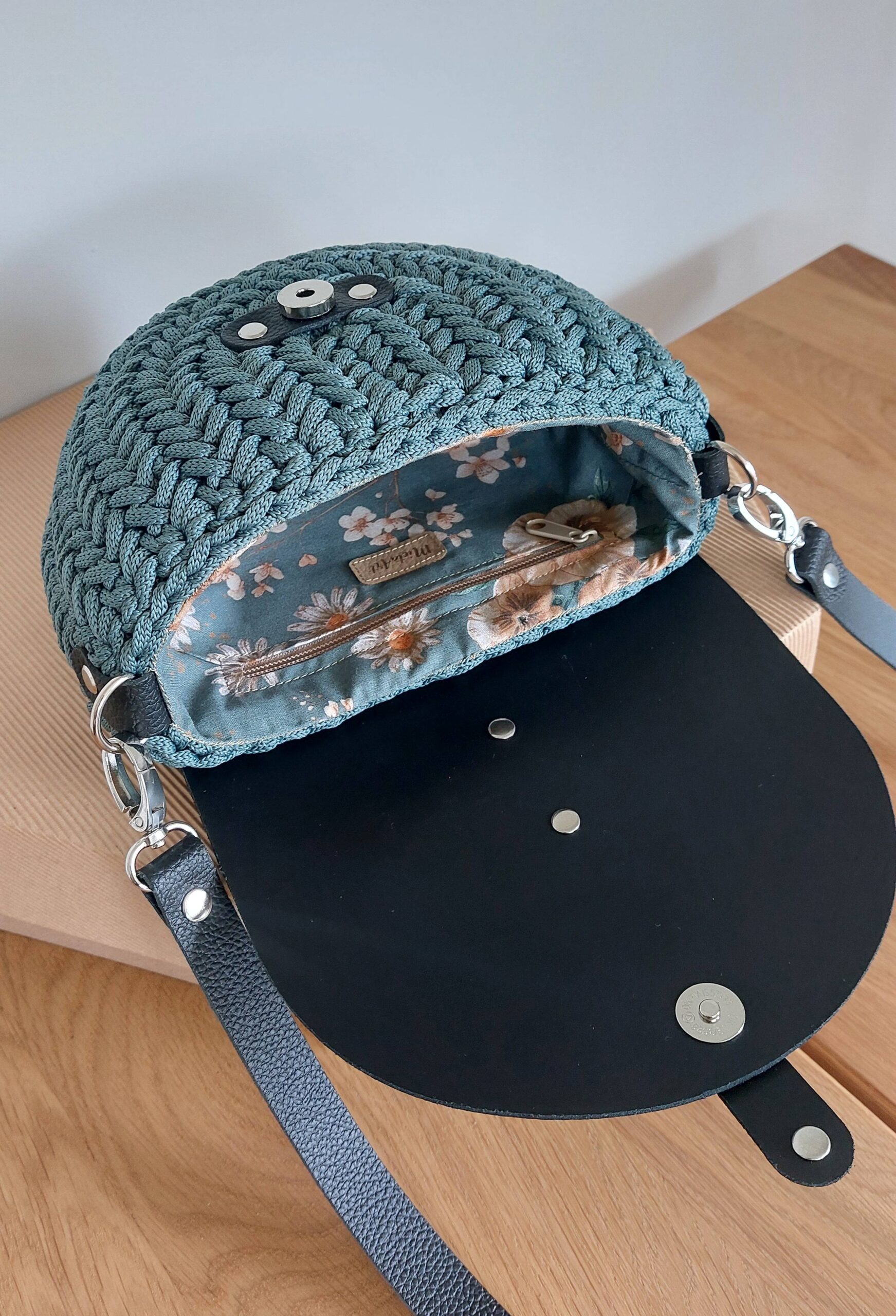 Ręcznie wykonana torebka średniej wielkości, zrobiona z wysokiej jakości sznurka (100% jedwab poliestrowy) oraz elementów ze skóry naturalnej. Zapinana na magnes, z bawełnianą podszewką i praktyczną kieszonką na zamek.