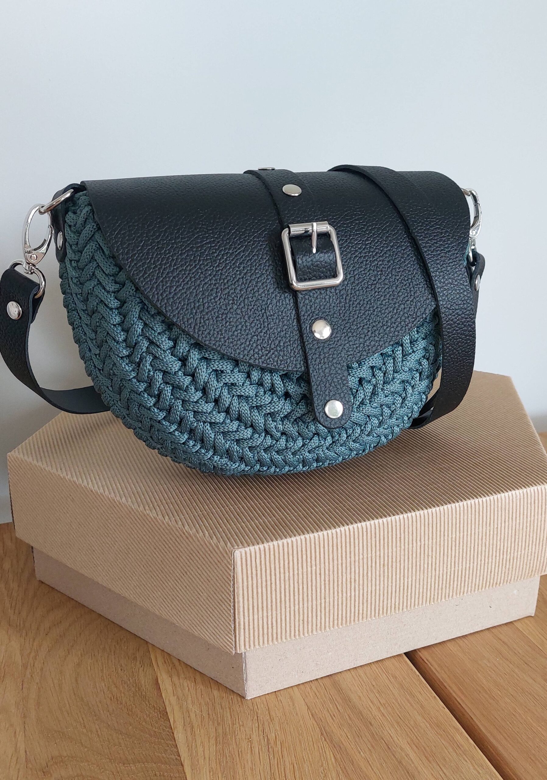 Ta wyjątkowa torebka powstaje z wysokiej jakości sznurka premium (100% jedwab poliestrowy), który nadaje jej subtelną strukturę i elegancki wygląd. Całość uzupełniają elementy ze skóry naturalnej – klapa, pasek oraz detale – tworząc harmonijną i ponadczasową kompozycję.